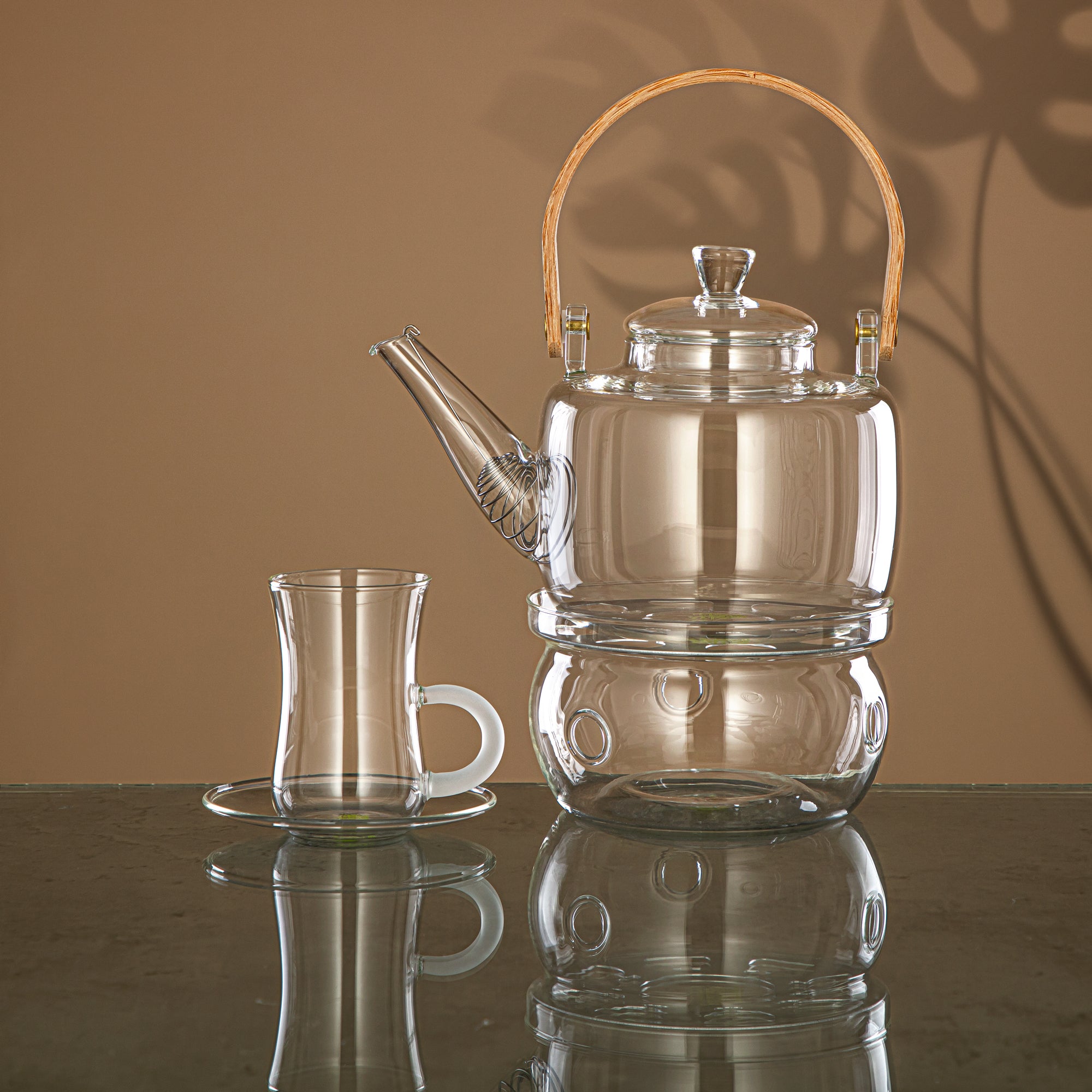 - تصميم أنيق: أكواب الشاي الزجاجية الشفافة تتميز بمقابض مزخرفة، بينما غلاية الشاي تتمتع بمقبض من الخيزران الجذاب.